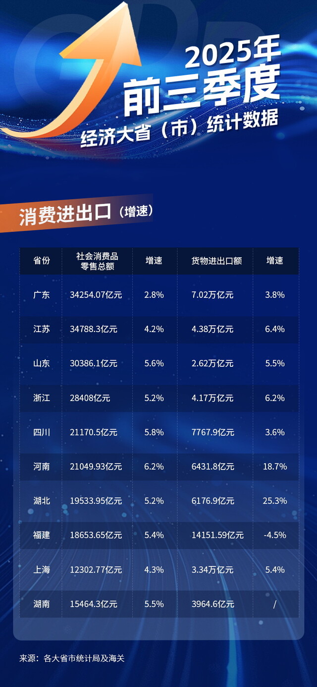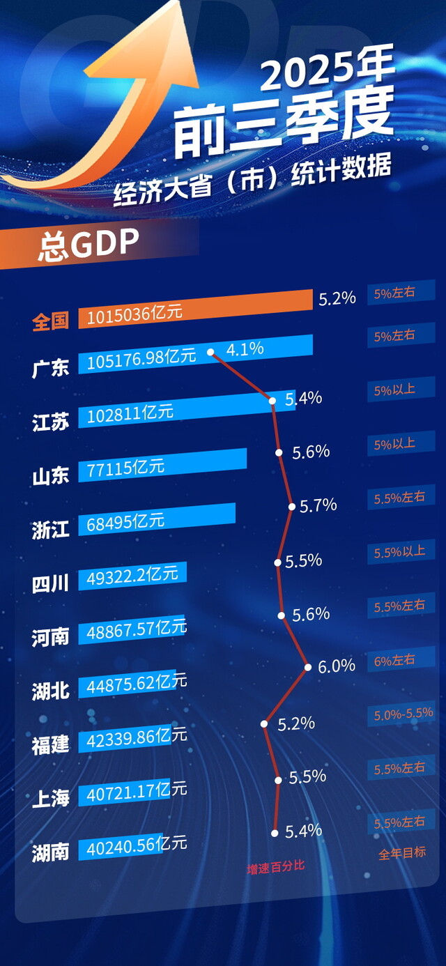 从数据看,广东、江苏的成绩十分显眼,首次用9个月时间把经济总量干到了10万亿元。去年前三季度,广东省GDP距离突破10万亿仅差60亿元,今年不出预料地迈上了这个台阶,达到10.5万亿元。紧随其后的江苏,前三季度GDP接近10.3万亿元。
