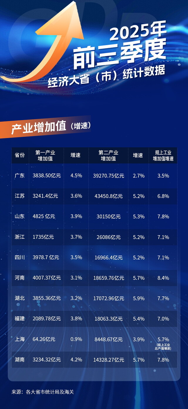 产业是推动高质量发展的动力支撑。从三次产业在全国的份额看,今年前三季度,经济十强省市第一产业增加值占全国比重53.17%,较“半年报”占比有所下降;第二产业增加值占比63.87%,较“半年报”占比略有提升;第三产业增加值占比60.14%,同样有所上升。