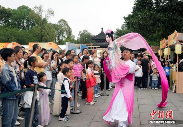 图为游客在成都武侯祠观看传统木偶戏《长绸舞》。 记者 安源 摄