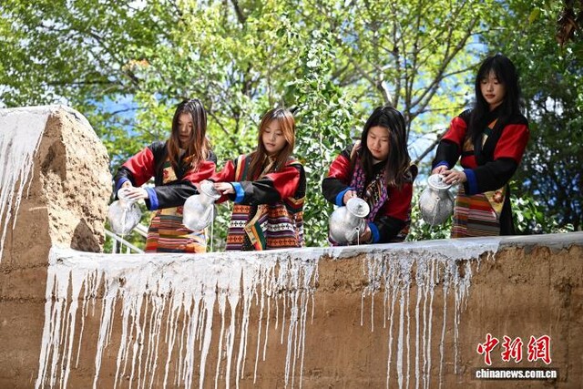 图为游客在四川省甘孜州乡城县穿上“疯装”体验“白色灌礼”。 记者 张浪 摄