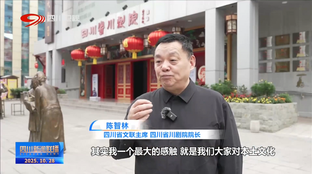 四川省文联主席、四川省川剧院院长 陈智林:其实我一个最大的感触,就是我们大家对本土文化,对我们自身的DNA文化有了新的认知以后,奠定了我们自己无穷的自信和深邃的文化感情,形成了我们文化的一种自信。