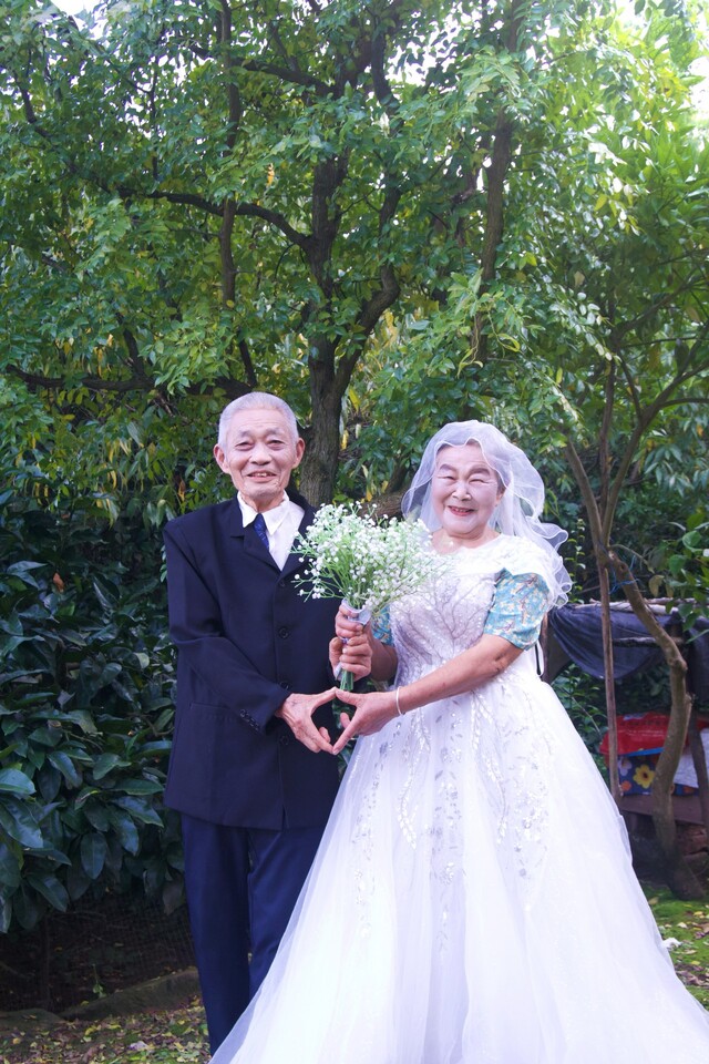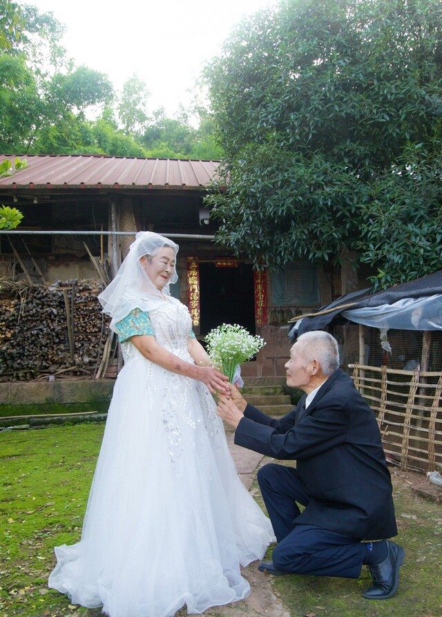 重阳节前夕,关祖苹带着婚纱和西装来到李仲益家。“李大爷,你要是晚出生60年,肯定是大帅哥,可以去拍电影。”他一边逗老人开心,一边指导拍摄。镜头里,李大爷颤抖着举起亲手编织的竹刷把,挨着手捧鲜花的老伴坐下,脸上洋溢着幸福的笑容,还尝试了单膝跪地献花的姿势。