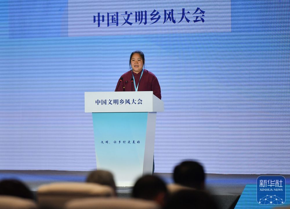 ↑ 10月29日,山东省沂水县朱家坪村村民张欣作为农民群众代表在中国文明乡风大会发言。
