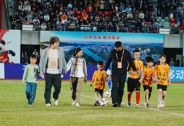 赛后,看台上,足球场内,是一片欢乐沸腾的海洋。为回馈球迷支持,广元队全体队员在队长乔俊的带领下,高擎印有“广元”字样的战旗绕场一周,与现场球迷亲切互动。合影环节,14名身着广元队比赛服的小球员格外亮眼,他们均来自苍溪县北门小学,其中13人是该校足球队队员,另有1人是革命先辈后代。