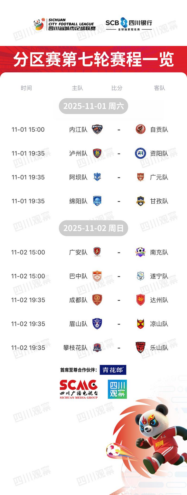 2025/2026四川银行四川省城市足球联赛(简称“川超”)分区赛第六轮将于11月1日开踢!本轮的9场对决将分别于11月1日(4场)和2日(5场)两个比赛日进行,为了方便各位球迷朋友观赛,观观整理了比赛日程,请查收!