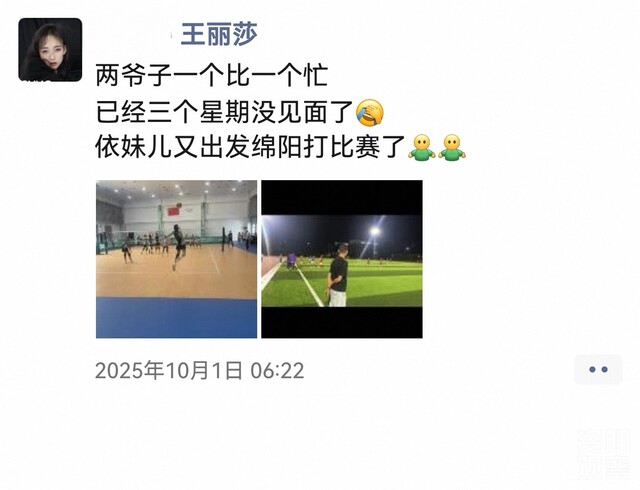她的初衷,源于深夜的一盏孤灯。“他每天早上七点多出门,忙到凌晨一两点。管球迷,管球员,根本顾不上家。”在她的手机里,存着一张10月1日发的朋友圈:孩子在练排球,老公在训足球,配文是“两爷子一个比一个忙,已经三个星期没有见面了”。她笑着,眼角有些疲惫,“你看,就是这样,你没法责怪他,只能帮他分担。”