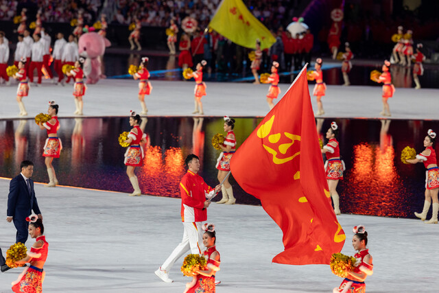 随着运动员代表团依次入场,身着统一服装的四川代表团格外抢眼。“锦绣天府・安逸四川!川籍健儿将发扬‘爱祖国、雄川体、闯新路、争第一’的四川体育精神!”激昂的现场介绍中,四川代表团整齐步伐走过主席台。