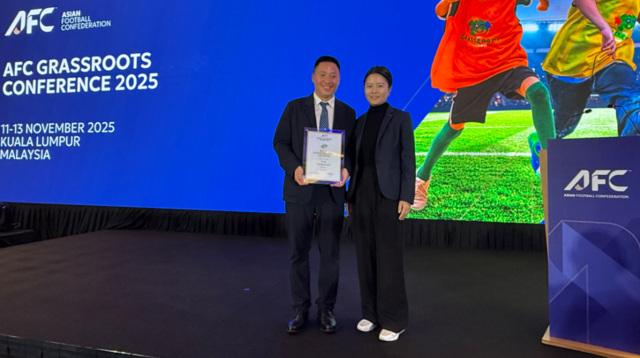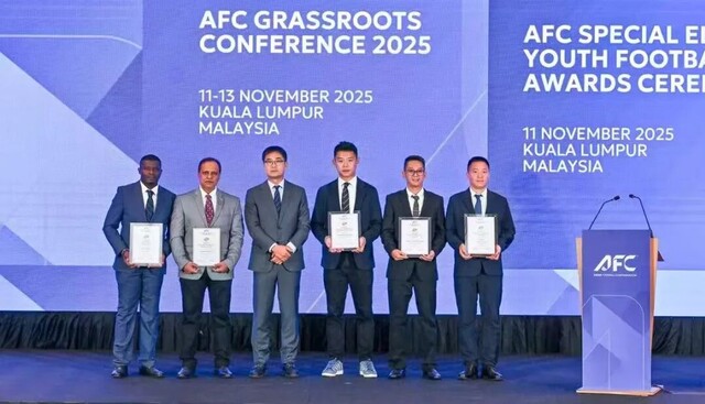 谭杰(右一)荣获“2025亚足联最佳草根足球领导者奖”