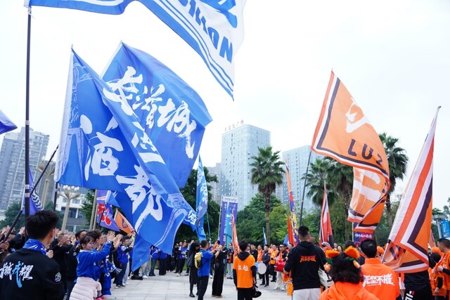 12时30分,身着橙色应援服的泸州球迷摆开阵形,伴随激昂的鼓点,十多面队旗在风中猎猎作响,“欢迎宜宾”的呐喊声震彻广场。随着宜宾球迷队伍抵达,“谢谢泸州”的响亮回应点燃了空气中的激情。双方球迷以拉歌互动,用歌声昭示对比赛的期待。