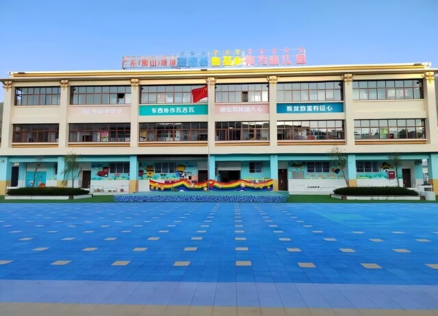 2020年,佛山市援建了全新的有为幼儿园。教学楼有三层,共5间教室和1间教师办公室。后来又修建了综合楼,总台捐赠了美术手工室、图书室、音乐舞蹈室的图书等教材和教学设备,以及空调、教学一体机,铺设了安全的悬浮地板。昔日狭窄的活动场地,变成了孩子们尽情奔跑的开阔操场。
