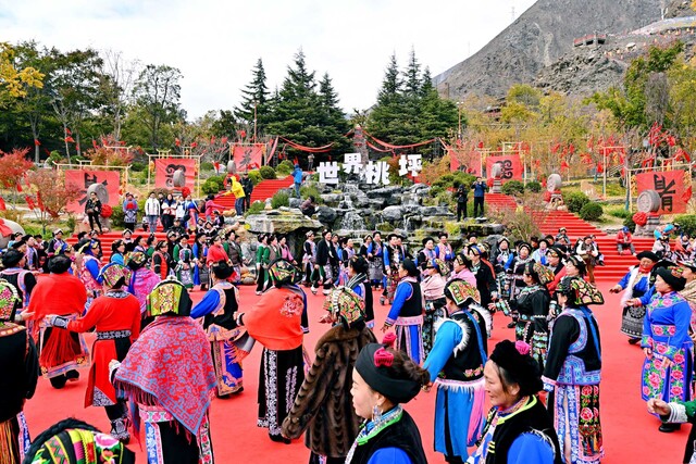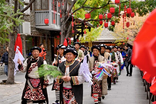 桃坪羌寨的新寨内,来自桃坪镇、薛城镇、通化乡、蒲溪乡四地的群众,身着绚丽的羌族节日盛装,组成四支各具地域特色的巡游队伍,穿梭在羌寨的街巷之中,将鲜活的羌族传统服饰之美展现得淋漓尽致。