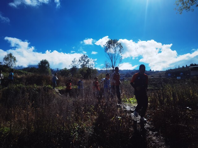 拉马正带着爱好足球的孩子们在山间小路练体能。