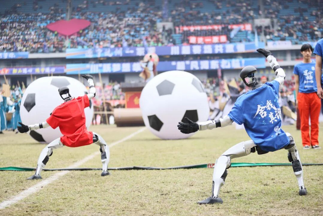 今(22)日,主场收官战开场节目《文脉球源·涪江竞流》,2名机器人和表演者共舞。全媒体首席记者刘昌松/摄