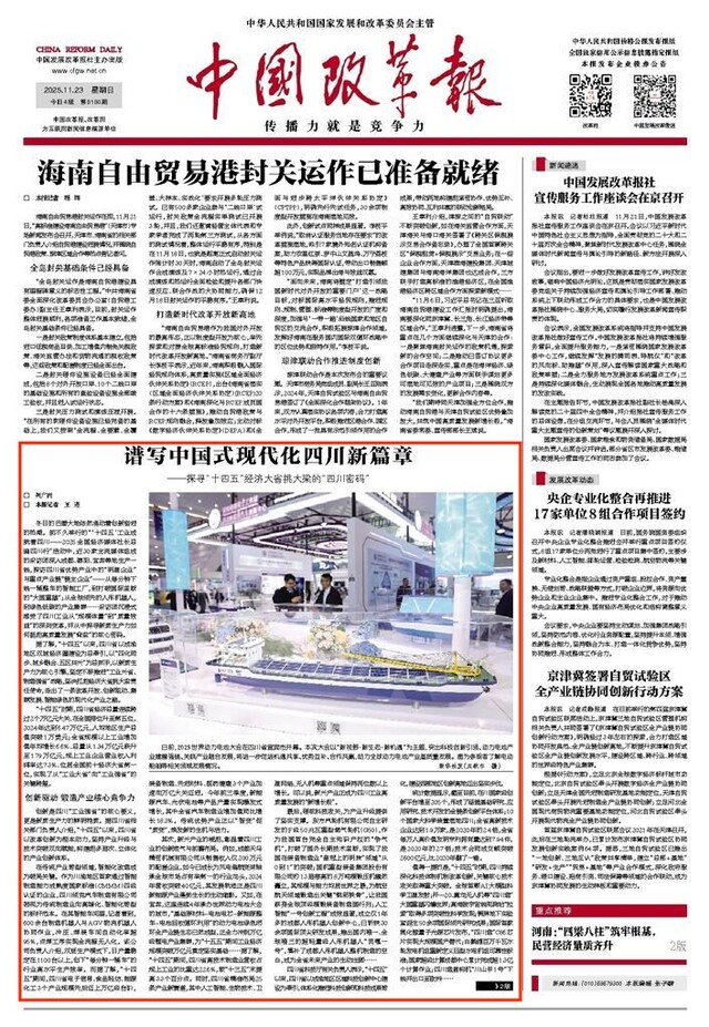 冬日的巴蜀大地依然涌动着创新奋进的热潮。前不久举行的“‘十四五’工业成就看四川——2025全国经济媒体社长总编四川行”活动中,近30家主流媒体组成的采访团深入成都、德阳、宜宾等地生产一线,探访四川省优势产业中的“明星企业”与重点产业链“链主企业”——从每分钟下线一辆整车的智能工厂,到打破国际垄断的“大国重器”;从全球领先的人形机器人,到绿色低碳的产业集群……采访团沉浸式感受了四川工业从“规模体量”到“质量效益”的深刻变革,并从中探寻新质生产力如何挺起高质量发展“脊梁”的核心密码。