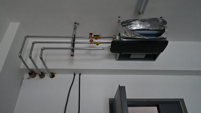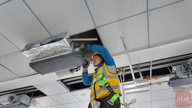 在越西县住房和城乡建设局工作人员王卓扬和韩帮远带领下,记者还来到位于越西中学男生宿舍的施工现场。多名工人正在开展管道切割和安装作业。“学生们上课期间就是我们的施工期。”韩帮远说。在楼层上方,长长的管道已布设完毕,且用橡塑棉进行了包裹,可以有效保温。走进一间宿舍,门的上方就是供暖设备的终端——风机盘,未来暖气将通过这里送入房间。