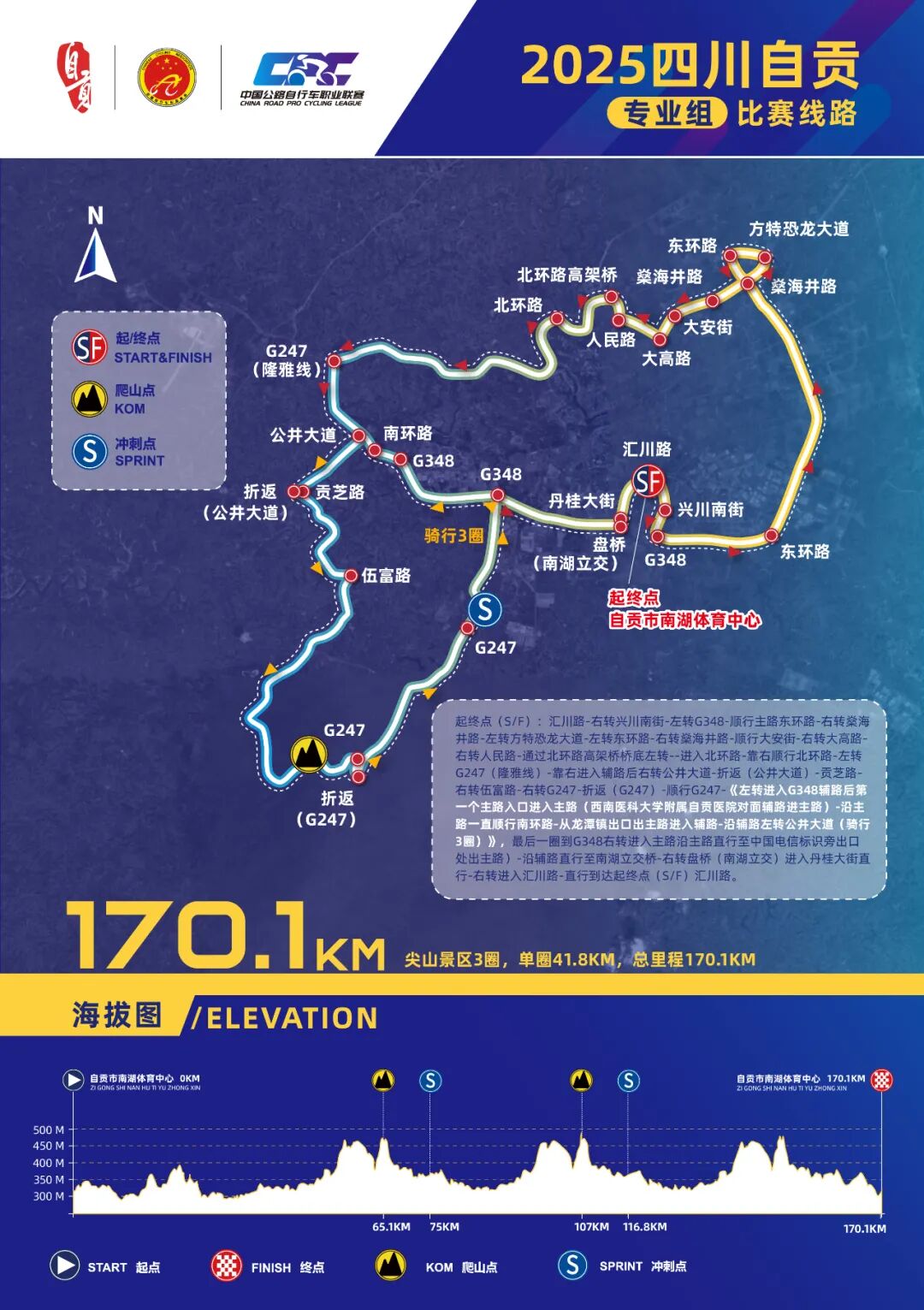 专业组全程约170.1公里,从自贡南湖体育中心出发,横跨自流井(含高新区)、贡井、大安、沿滩等主要城区。途经燊海井、方特恐龙大道等自贡特色地标,在风驰电掣中,带领选手与观众领略自贡独特的城市魅力与文化底蕴。