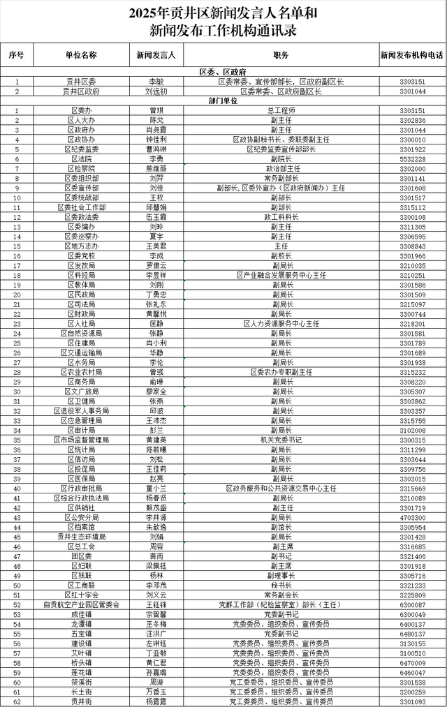 2025年贡井区新闻发言人名单和新闻发布工作机构通讯录