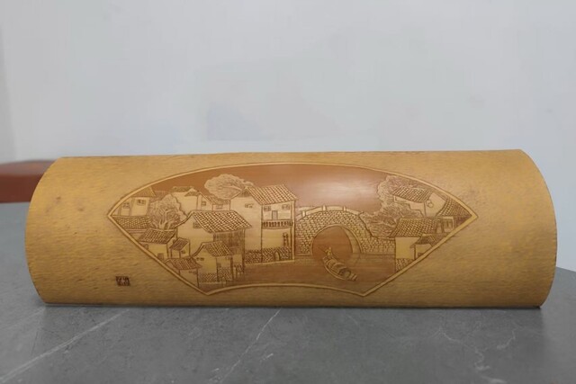 说话间,黄建拿起一个新雕的帽筒,竹筒上山水间的亭台栩栩如生,不少地方还是镂空的,平面图案瞬间有了立体感。“这镂空的活儿,就得用我自己锻的细刀。”他摩挲着雕件,眼神专注,“雕刻得静下来,一坐就是几小时。现在的年轻人,很难耐住这份慢。”