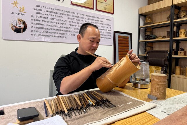 “我师父以前雕一件卖一件,家里从来没存货。”黄建说,复杂的工艺加上海外稀缺的竹资源,让纳溪竹雕在国外成了“高奢”艺术品。2023年成都大运会期间,黄建作为非遗传承人受邀去展示,“我攒了七八年的作品,一开展就被抢空了!”那场盛会,也让原本藏于川南的竹雕,一下子站上了世界的舞台。