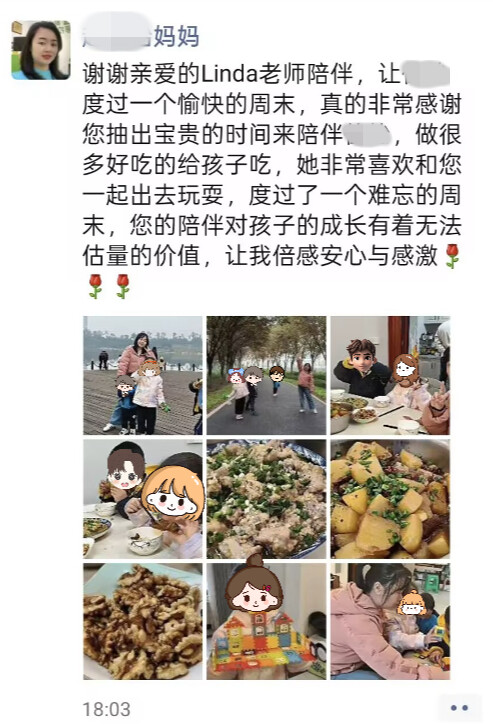 “老师牺牲周末休息时间悉心照料、温情陪伴孩子,对孩子的成长有着无法估量的价值,也让我倍感安心与感激。”赵怡(化名)的妈妈张敏告诉记者,他们家也在贵州仁怀,孩子半个月才回去一次。这次家宴举办后,张敏把班主任林钟莉发来的照片保存下来,发了九宫格朋友圈:孩子们在逛公园、啃鸡腿、拼积木,笑得很灿烂。
