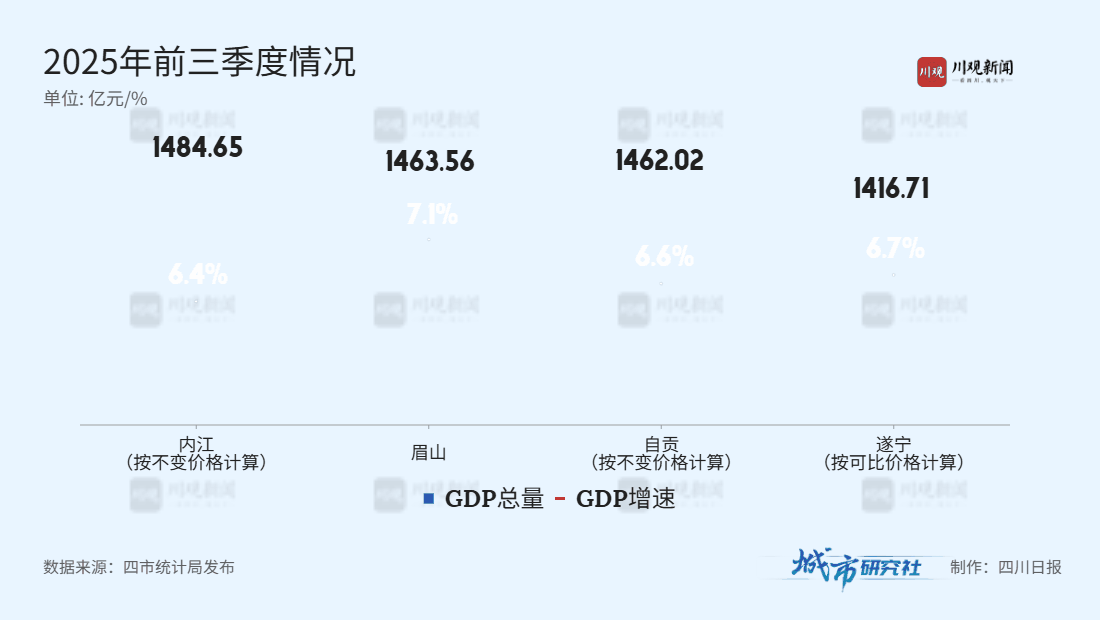 审视2025年前三季度四川21个市州地区生产总值排位,一个罕见的“拥挤”区间浮现——第10至13名的内江(1484.65亿元)、眉山(1463.56亿元)、自贡(1462.02亿元)、遂宁(1416.71亿元),四市的GDP紧紧压缩在1400亿元至1500亿元的狭窄带宽内。