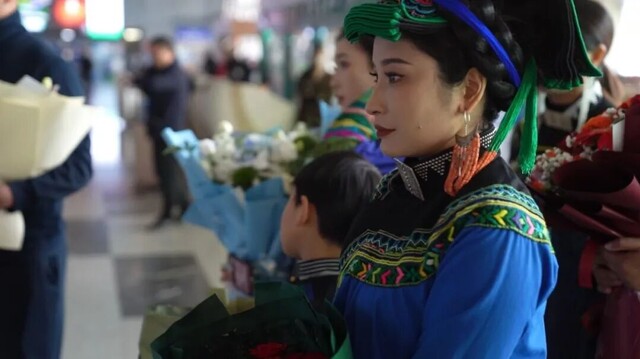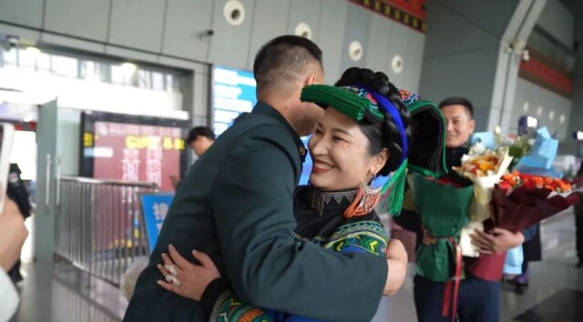 中午12点,约其依落乘坐的航班准时抵达西昌青山机场。沙梅手捧鲜花,在人群中焦急等待;亲友们拉起“没能送你入伍,却愿接你凯旋”的横幅,字里行间写满思念与牵挂。