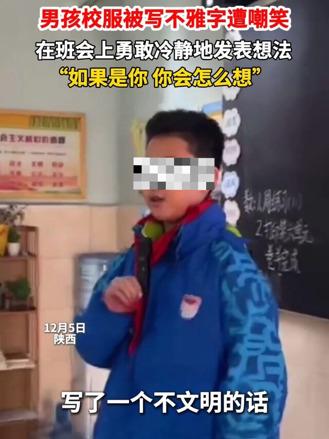 近日,西安一个9岁男孩的校服背后被写不雅文字,遭同学嘲笑。他拒绝妈妈出面为他“撑腰”,而是选择自己在班会上勇敢发声反击,最终换来同学的真诚道歉,也迎来无数网友的点赞。