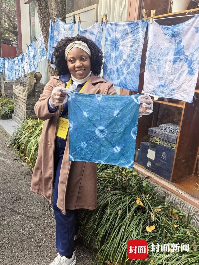 扎染体验区早已备好素白棉布、靛蓝染缸和各式夹具,工作人员手持纱线示范着“夹缬”技法,用流利的英文细致讲解:“先将棉布折叠成喜欢的形状,用夹子固定紧实,再浸入染缸,留白的部分会形成独特花纹。”