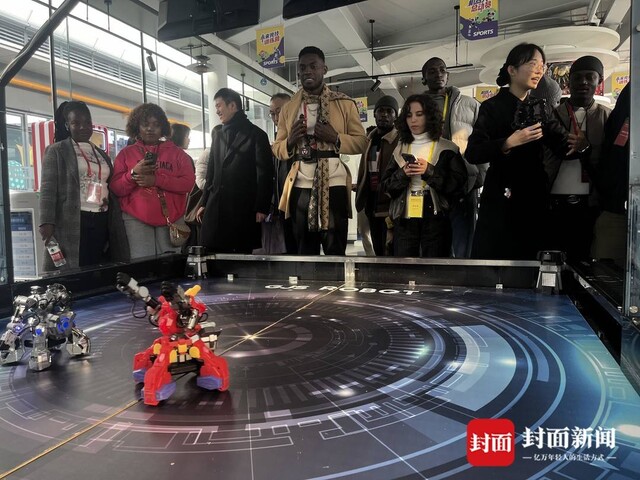 机器人体验馆内更是热闹非凡。会作揖会跳跃,还会卖萌的机器狗,跟着音乐节拍扭动身躯跳“广场舞”的人形机器人,让留学生们忍俊不禁。性格外向的他们围上前去,或伸手与机器狗互动,或跟着机器人的舞步模仿动作,馆内满是欢声笑语。机器人对垒台前,四川农业大学加蓬留学生李安德和伙伴们手持遥控器,操控着机器人展开“PK”,金属碰撞的清脆声响与围观者的阵阵喝彩声交织在一起;一旁的糖画机器人正精准勾勒出卡通图案,自动咖啡机一键出品香醇咖啡,让女生们频频发出“哇”的赞叹,指尖不停按下拍照键。