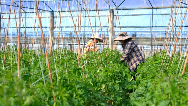 农户在番茄地里开展田间管理