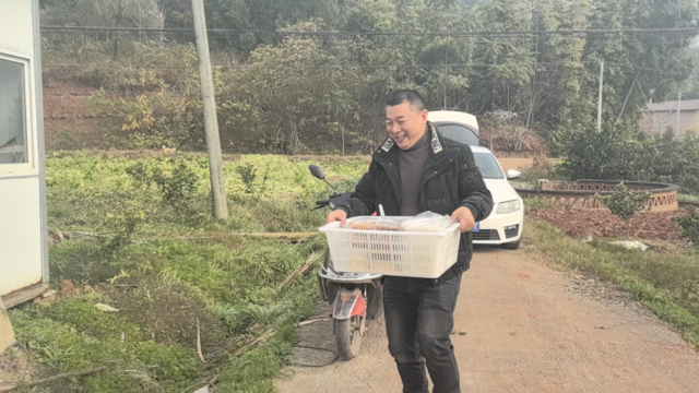 上午11点20分,工作人员将打包好的10份工作餐装在筐里,驾着车往十多公里外的迎接镇大河村驶去。20分钟后,工作人员端着筐,将餐食送到了果园。原来,果园正在进行柑橘修剪工作,为满足工人们的用餐需求,果园负责人得知食堂开始运营后,一早就向食堂订了餐。