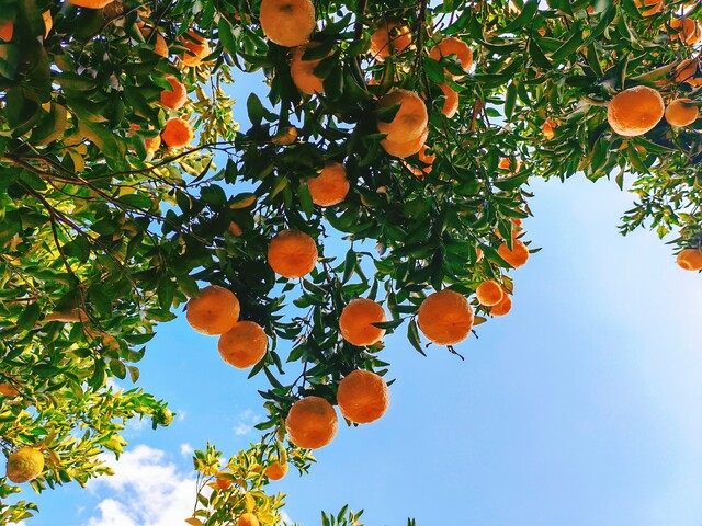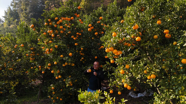 在热河镇的椪柑园,蒋永康走进果园深处,在不同朝向的果树上分别挑选了几个果子。他剥开一个向阳的果子,果肉饱满,汁水丰盈。