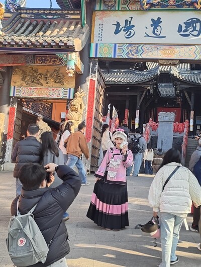 他们将超市空间巧妙分区,一半继续维持日常零售,另一半则布置成古风盎然的化妆间、选片区和服饰陈列区。定价从199元到399元不等的旅拍套餐,精准契合了游客“打卡留念”的需求。生意最火爆时,他们需要聘请化妆师、摄影师、保洁20余人,一天接待游客40多人。