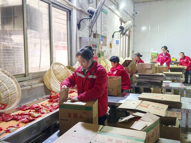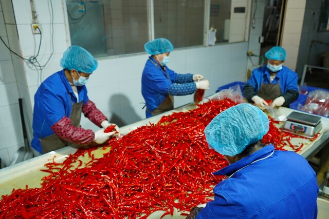 川龙酿造食品有限公司的生产车间内工人正在分装辣椒。受访者供图