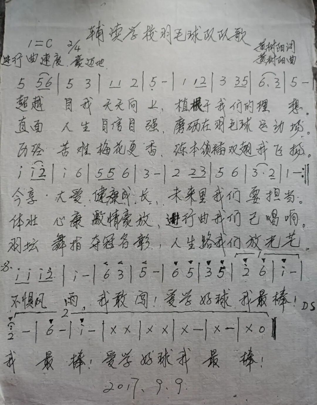 后来的日子里,黄树阳自己作曲作词,写出了《辅读学校羽毛球队队歌》,孩子们至今都还在传唱。同时,他积极发动募捐,许多热心人士纷纷送来球拍、文体用品等。学校也给予大力支持,为孩子们准备队服、规划新的羽毛球场地。“我想给孩子们带来快乐。”是黄树阳的心愿,也是他与特奥羽毛球结缘的初心。