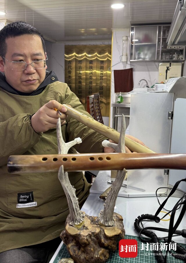 2005年,即蒋小龙23岁那年,他从央视纪录片上看到,鹰笛(骨笛的一种,用雄鹰翅骨制作)制作技艺面临失传,便用业余时间悄悄学习骨笛制作技艺。2022年,他更是辞掉工作,把自己的家改成工作室,全职研究、学习骨笛制作技艺。“问道‘奇人’和博览群书,这是我学习的绝招。”蒋小龙如此总结。