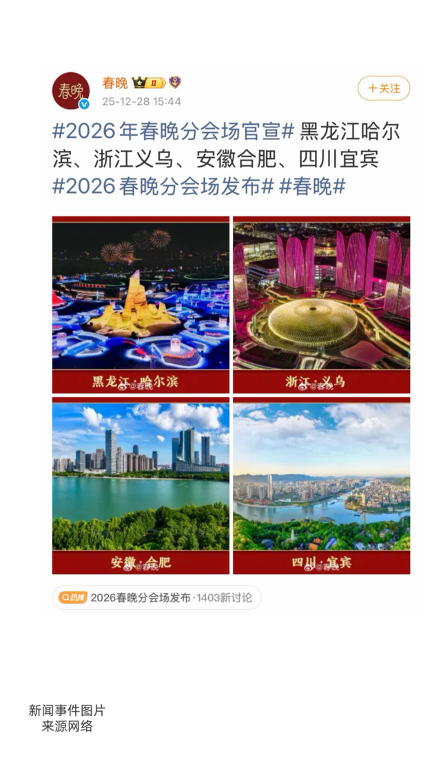 28日,央视春晚官宣设立宜宾分会场。这是宜宾继2023年央视中秋晚会、2025年央视七夕晚会之后,再度“牵手”国家级文艺IP,也是四川第三次迎来春晚分会场。