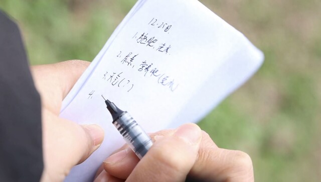 田埂上,西哩家庭农场负责人王钰双蹲下身,指尖轻轻拂过发黄的苗叶,随后,从口袋里掏出几张白纸,飞快写道:“12.25,施肥,浇水、营养肥兑水,后续关注天气,制定灌溉计划……”