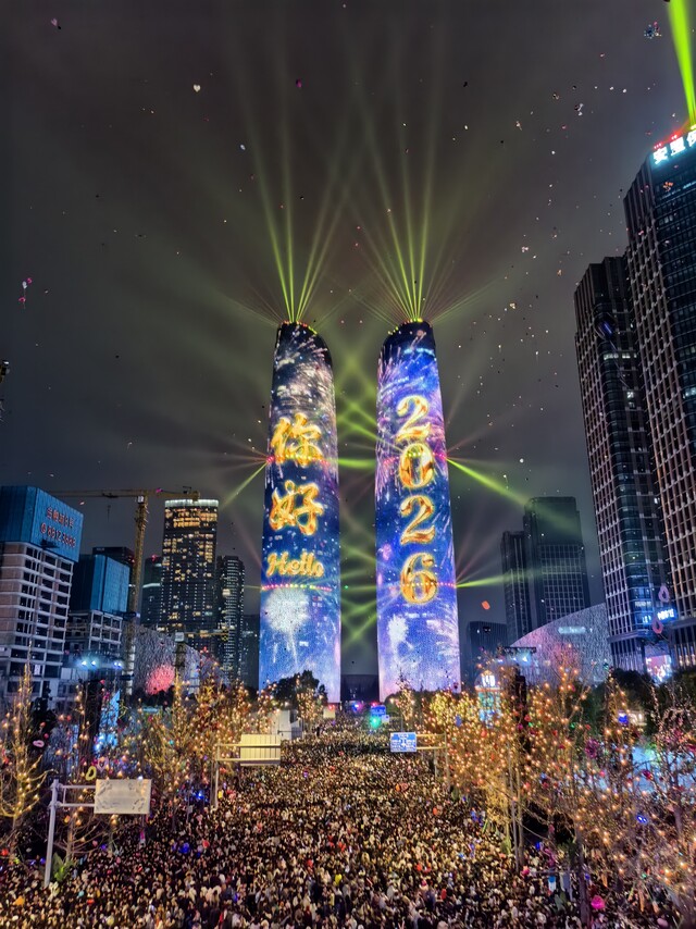 随着时间逼近零点,全场目光聚焦于天府双塔。巨大的数字开始跳动:“5、4、3、2、1——2026,新年快乐!”大家与身旁的亲友甚至陌生人相视而笑,共同定格2026年的第一个珍贵瞬间。