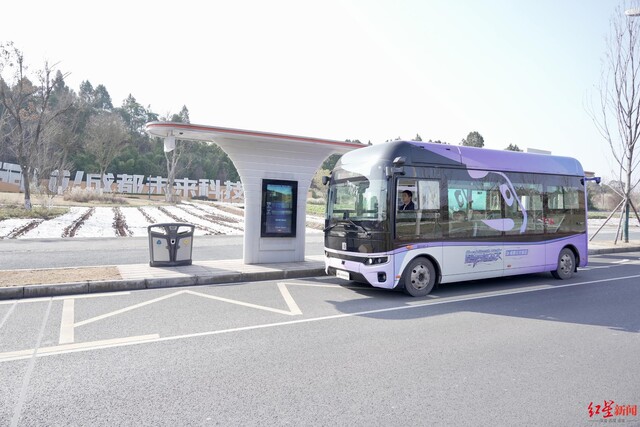 等到下午2时,一辆紫色涂装的小公交车,缓缓驶入始发站。第一眼看,这辆车驾驶位也坐了“司机”,与普通公交并无太大区别,但上车后可以看到,“司机”并没触碰方向盘,全程由智慧平台操作。