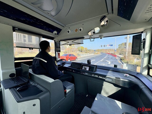 随着记者入座,车辆缓缓启动驶出车站。车辆起步后平稳得几乎无感,平均30公里的时速既高效又平稳,遇到路口红灯时自动减速停车,前方有行人横穿时精准避让,到站时稳稳停靠在站台指定区域。车内显示屏实时同步行驶路线、车速及站点信息,原本的驾驶位上,安全员只需专注监控行驶状态,无需过多操作。