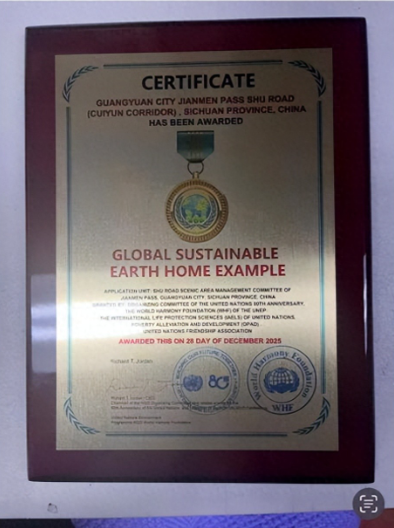 据悉,在联合国成立80周年之际,联合国环境规划署(UNEP)和联合国经济及社会理事会(ECOSOC)旗下的非政府组织——世界和谐基金会、联合国生态生命安全科学院、联合国减贫与发展组织、联合国友好理事会等共同成立了联合国80周年庆典活动组委会。组委会秉承古特雷斯秘书长关于“支持联合国80周年改革系列活动”的倡议,共同发起可持续“地球家园”活动,并设立全球可持续“地球家园”范例奖。该奖项旨在全球范围内遴选并表扬在践行《2030年可持续发展议程》、推动“人与自然和谐共生”方面具有突出创新性与全球示范意义的地区。评选工作于2025年启动,经过由前联合国官员、国际生态环保领域权威专家组成的委员会严格评审,剑门蜀道(翠云廊)最终以其跨越数百年的系统性、可持续性生态保护智慧与实践,获得评审团的高度评价,成为该奖项的首批获奖典范。