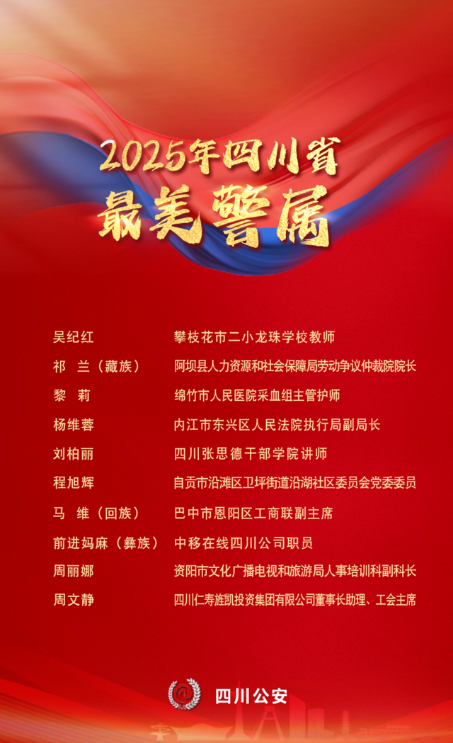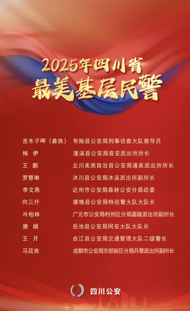 2025年10月,四川省公安厅联合四川省委宣传部组织开展了2025年四川省“最美基层民警、最美警属”学习宣传活动。活动开展以来,全省各市(州)党委宣传部、公安局精心组织策划,深入宣传展示,严格审核推荐,集中宣传选树了一批奋战在公安一线,严格规范公正文明执法,在法治公安建设中勇于担当作为的优秀基层民警,宣传选树了一批涵养家庭美德、勇挑家庭重担的优秀警属。