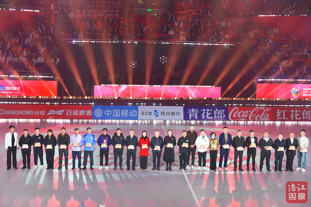 入场环节,21支市州代表队与各界嘉宾共同踏上“城市荣耀之路”步入会场。其中,绵阳阵容由绵阳市新闻传媒中心主持人何力,绵阳九洲长虹队领队张辅,主教练倪俊和6名运动员代表——周翥、刘鹏、肖俊、沈建平、陈炜、杨虎组成。