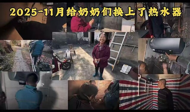 他的“事情”,记录在视频里,更落实在村庄中:2025年,他为老人剪头发、带奶奶坐飞机、为老人过生日、更换床垫、发放物资……还有更多不那么“被看见”的日常:修厕所、安热水器、打扫卫生。今年以来,团队已为五六户老人完成厕所改造。