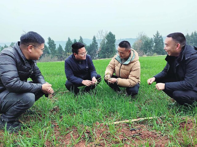 岁末年初,中江县黄鹿镇利兴村,俊熙家庭农场的麦田已连成一片“绿毯”,新苗齐齐整整,在冬日阳光下迸发出勃勃生机。该县农技站站长李小龙俯身查看后,对着农场主直夸:“苗齐、苗壮,长势不错!”