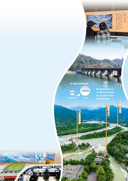 在都江堰灌区指挥中心,电子大屏幕上跳动着各类数据,指挥中心主任李劲介绍:“渠首鱼嘴、飞沙堰等关键部位都安装了摄像头、传感器等设备,可以实时感知水位、流量和工情变化。目前已完成渠首26.7平方公里数字孪生实景建模,实现风险‘可视化、可预警、可调度’。”