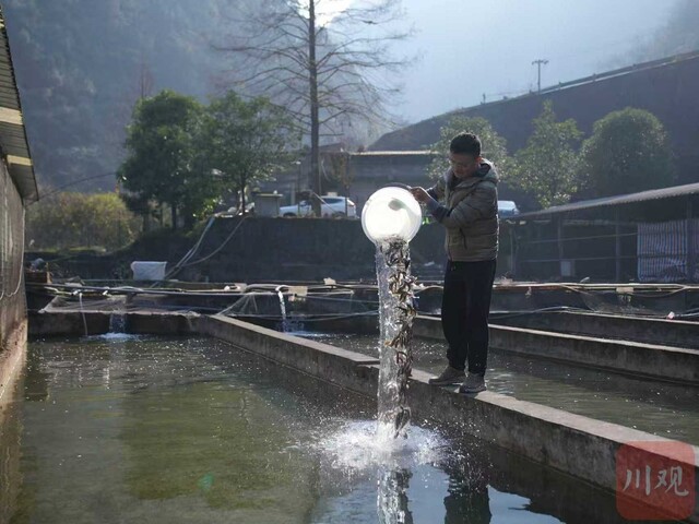 “开饭咯!”1月9日下午,杨焕超从基地内的饵料鱼池内舀起小半桶鱼苗,用食盐浸泡消毒5分钟后,提着桶向川陕哲罗鲑的培育池走去。