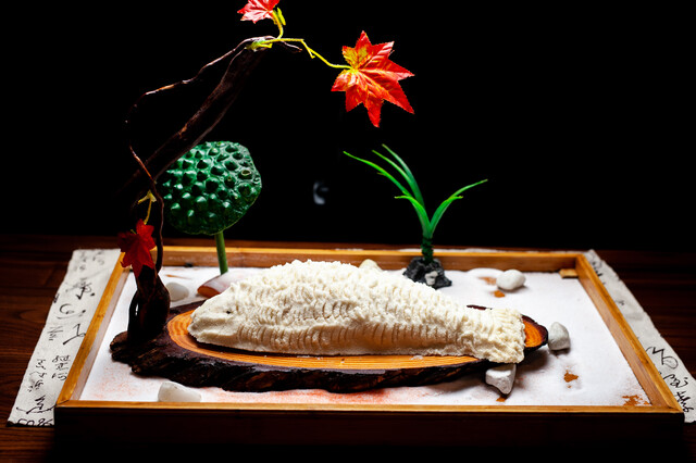 厨师以“千年卓筒井非遗古盐”为唯一基底,这也是菜品“盐为鱼增鲜”的核心奥秘——此盐纯净无杂、富含天然矿物质,能温和渗透鱼肉肌理,勾勒出深邃咸鲜底味,而非掩盖本鲜。调制时按五斤盐搭配六至七个蛋清的黄金比例顺时针搅拌,至盐泥粘稠不结块不掉落为宜,蛋清既增强粘性让盐泥紧密贴合鱼身,更能让烤制后形成坚硬的“黄金盔甲”,牢牢锁住鱼肉汁水。裹制时需均匀敷满鱼身,厚度控制在1-2厘米,边角仔细塑形无遗漏缝隙,从源头守住食材本真风味,是裸烹艺术的基础铺垫。