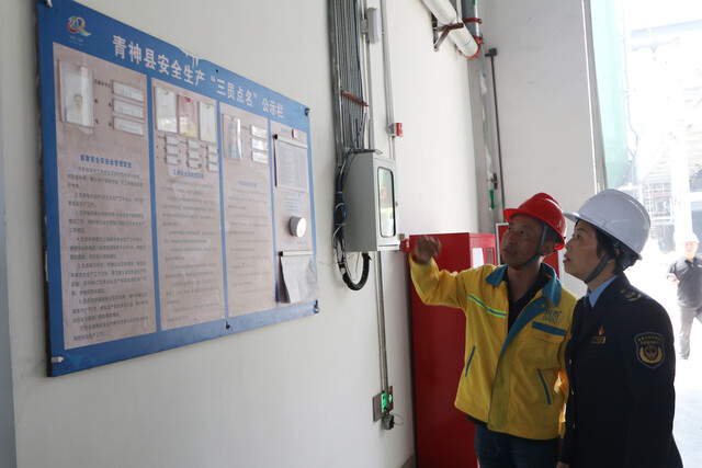 陈建英(右一)查看青神县企业开展“三员点名”情况。